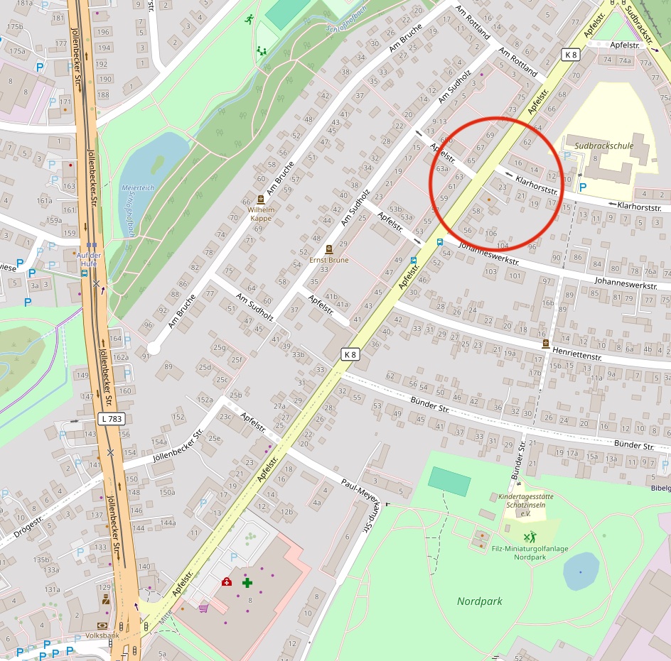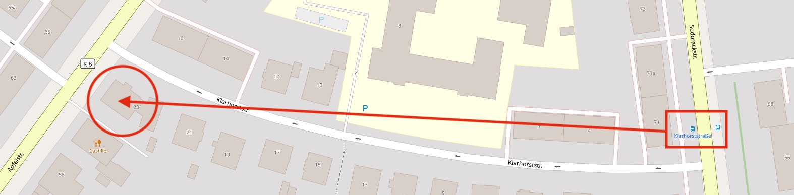 Unser zentrales Büro – die Geschäftsstelle – befindet sich nahe der Sudbrackschule an der Ecke Apfelstraße / Klarhorststraße und war mal eine Bäckerei. Der Eingang ist an der Apfelstraße und gut durch die bunt beklebten Fenster zu erkennen. Die Adresse lautet: Klarhorststr. 23, 33613 Bielefeld.